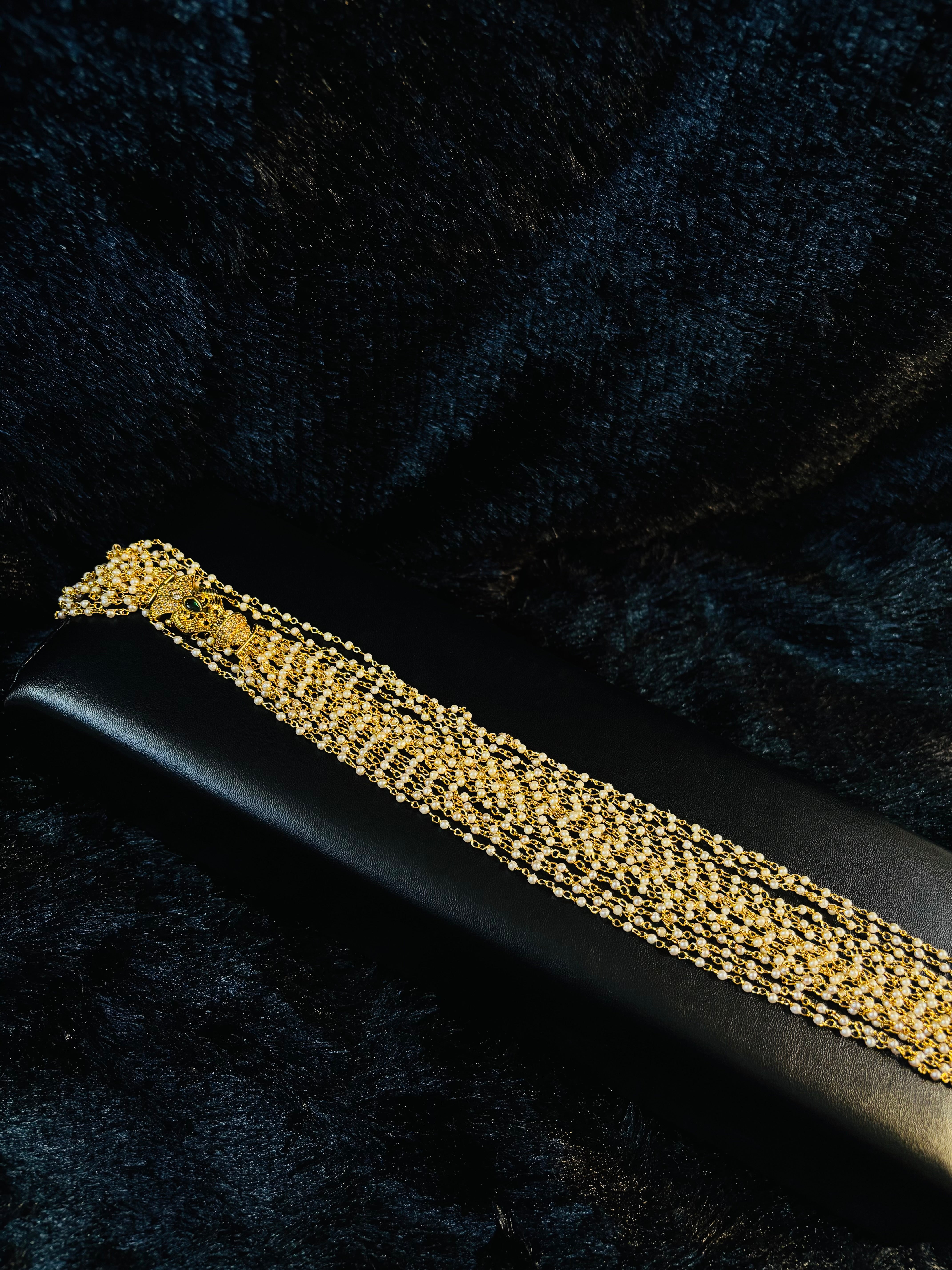 Elegant gold-toned layered necklace with pearl accents and a decorative goddess pendant. The multi-strand design adds a luxurious, traditional touch suitable for festive or everyday wear. Crafted with high-quality gold-plated chains and white pearls, it features a secure clasp for comfortable fitting.